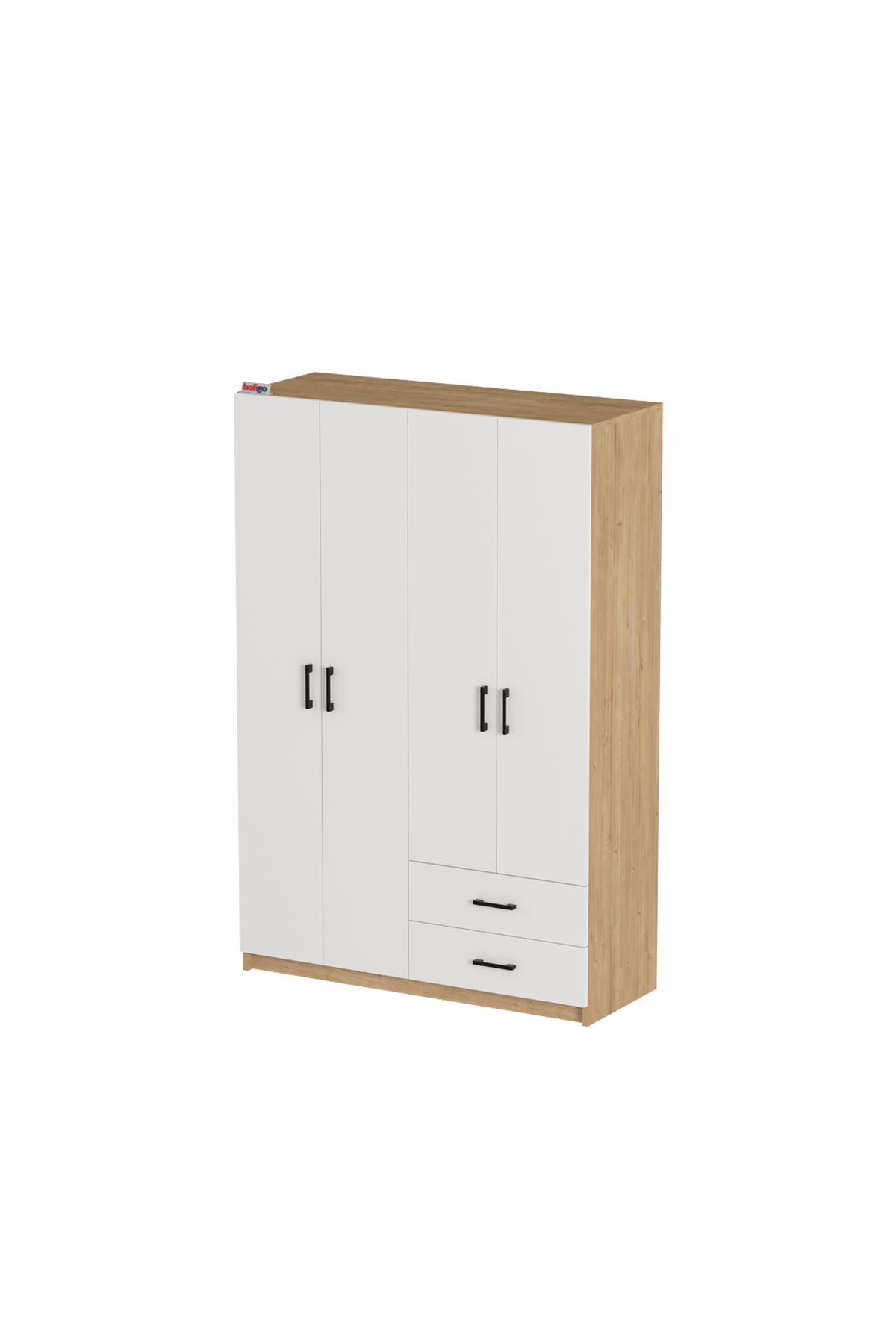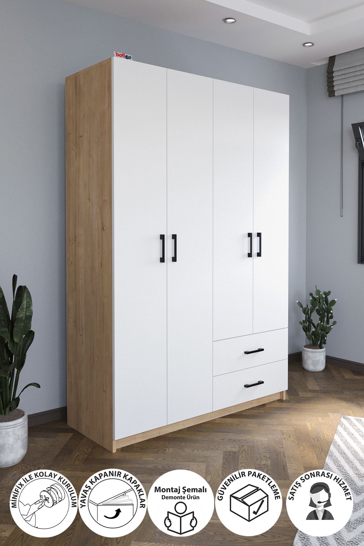 Bofigo 4 Kapaklı 2 Çekmeceli 5 Raflı Gardırop Elbise Dolabı 4 Kapaklı Gardırop Smyrna Safir Meşe Beyaz özel kolisi içinde demonte olarak sevk edilir.
