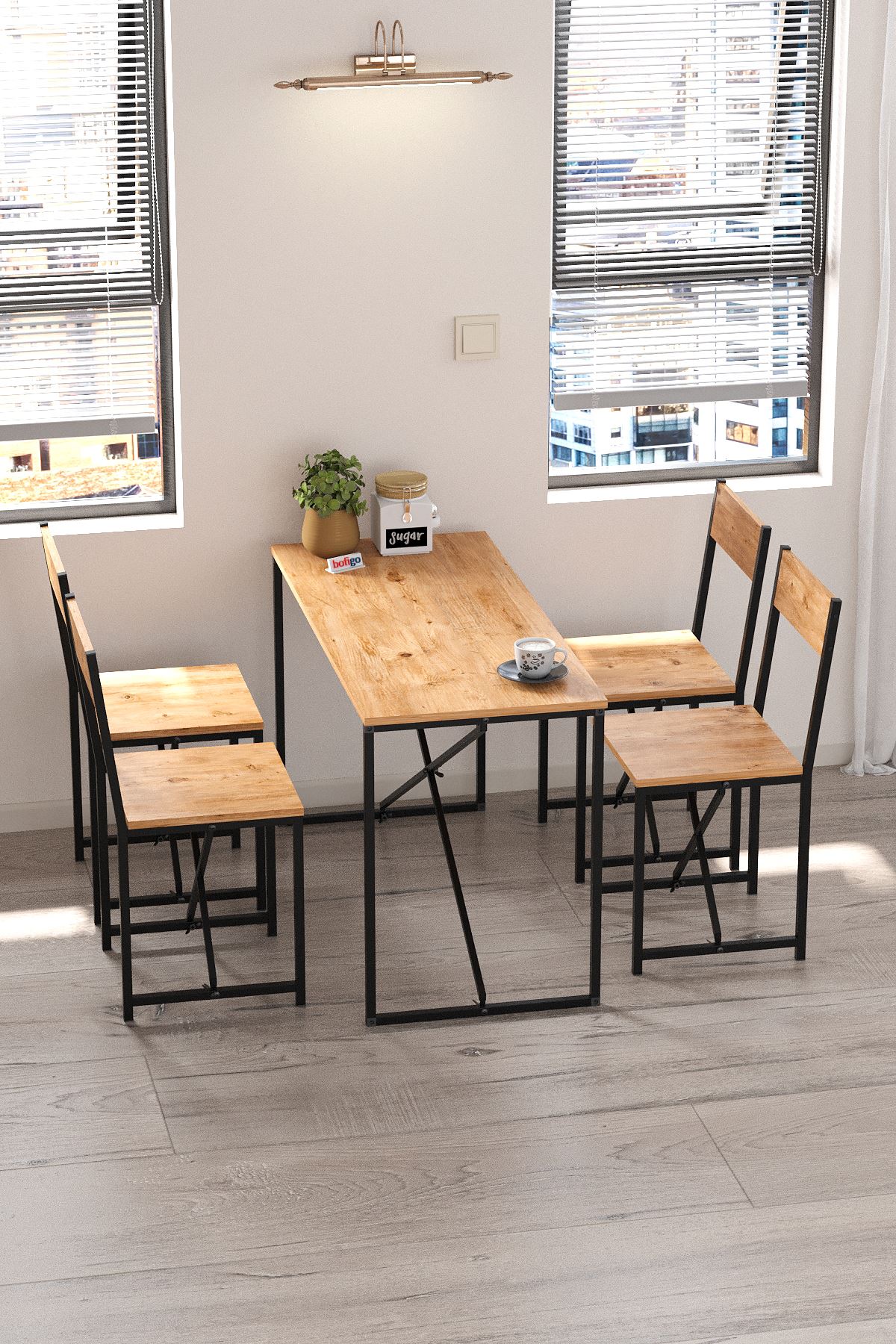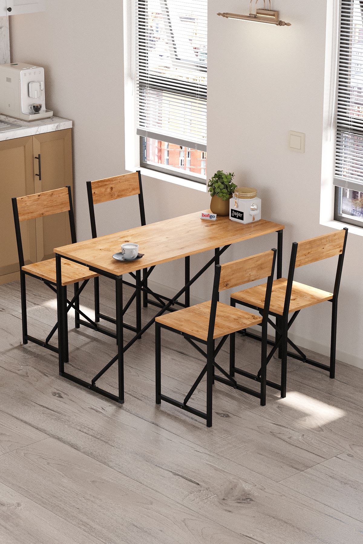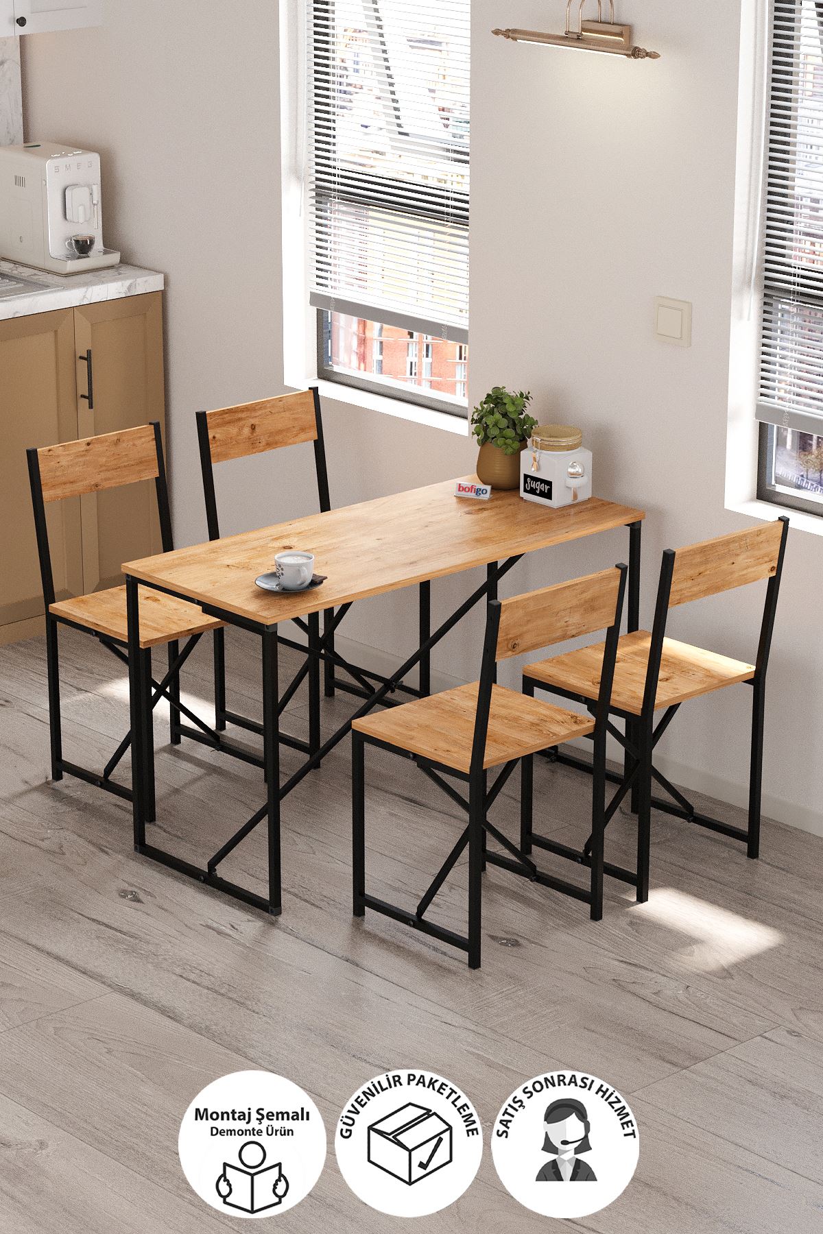 Modern tasarımı ve sağlam yapısıyla Bofigo Mutfak Masa ve Sandalye Seti, evinizin havasını değiştiriyor. Hem dekoratif hem fonksiyonel olan bu masa seti, özel kolisi içinde demonte olarak gönderilmektedir.
